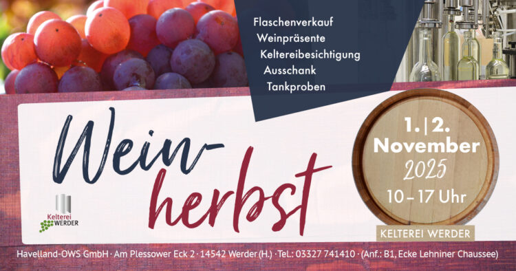 Wir freuen uns Sie am 1. und 2. November 2025 ab 10:00 Uhr in unserer Kelterei in Werder begrüßen zu dürfen! Besichtigen Sie unsere Kelterei und probieren Sie unseren Winzerglühwein. Share